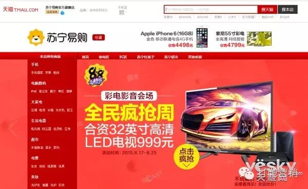 不久前天猫超市大手笔抛出10亿元红包进军北京市场,算是一次见面礼。而国亲期间和苏宁的家电优惠大促,才是双主场战略落地后的首个动作。从9月25日~10月9日,天猫将携手苏宁,并集合数码家电知名品牌热销机型大力度促销(比如iphone6s国行售价5288元起,并提供花呗9期借贷,0首付0利息)。活动期间,北京地区的用户有机会参与领取100元消费红包,红包总额将超过10亿元。