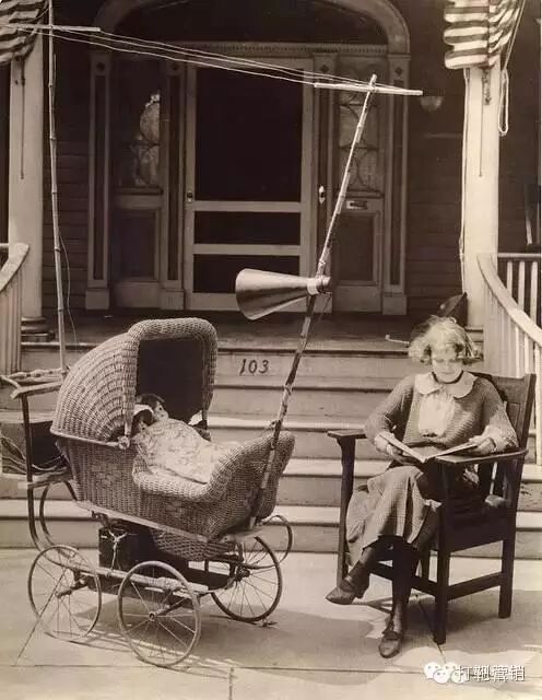收音机婴儿手推车,婴儿车上配备有一台收音机,含天线和扩音器,以此来使宝宝保持安静。美国,1921年