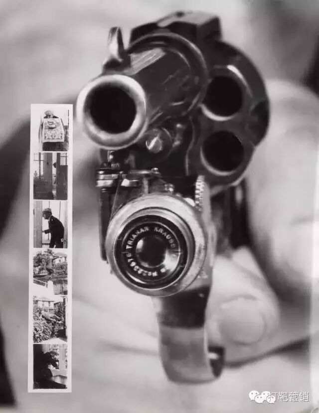 左轮手枪式/转筒式照相机,Colt38带有一个小型照相机,用手扣动扳机时,它就能够自动拍照。图像左侧是该相机拍摄的6张照片。纽约,1938年