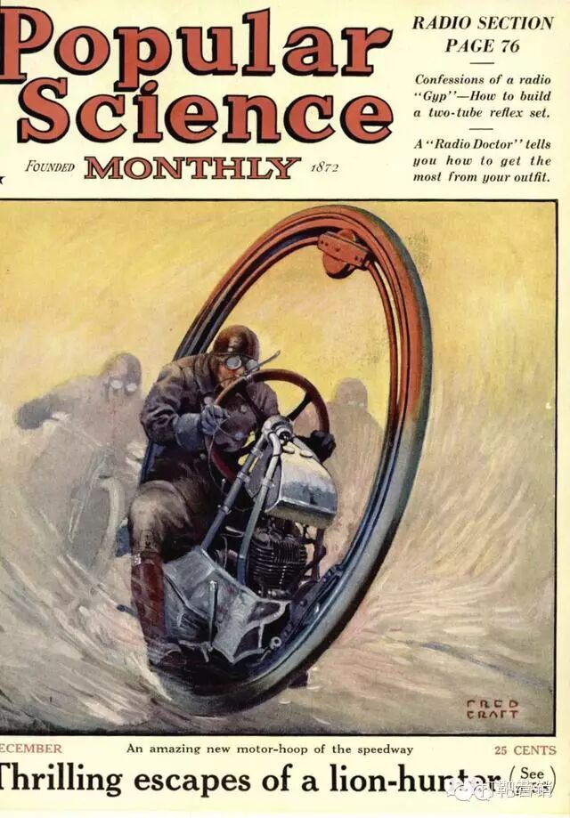 独轮车在当年一度被很多人看好,并预言会成为主流交通工具……当然,这个预言并未实现。因为我实在也是没太看出来这种独轮车的优点,说缺点倒是一大堆:稳定性差,驾驶视野受限(从上图你已经能够领略到这一点),不容易控制方向等等。不过这并不妨碍这种巨大的怪物成为当年很潮骚的玩意儿: